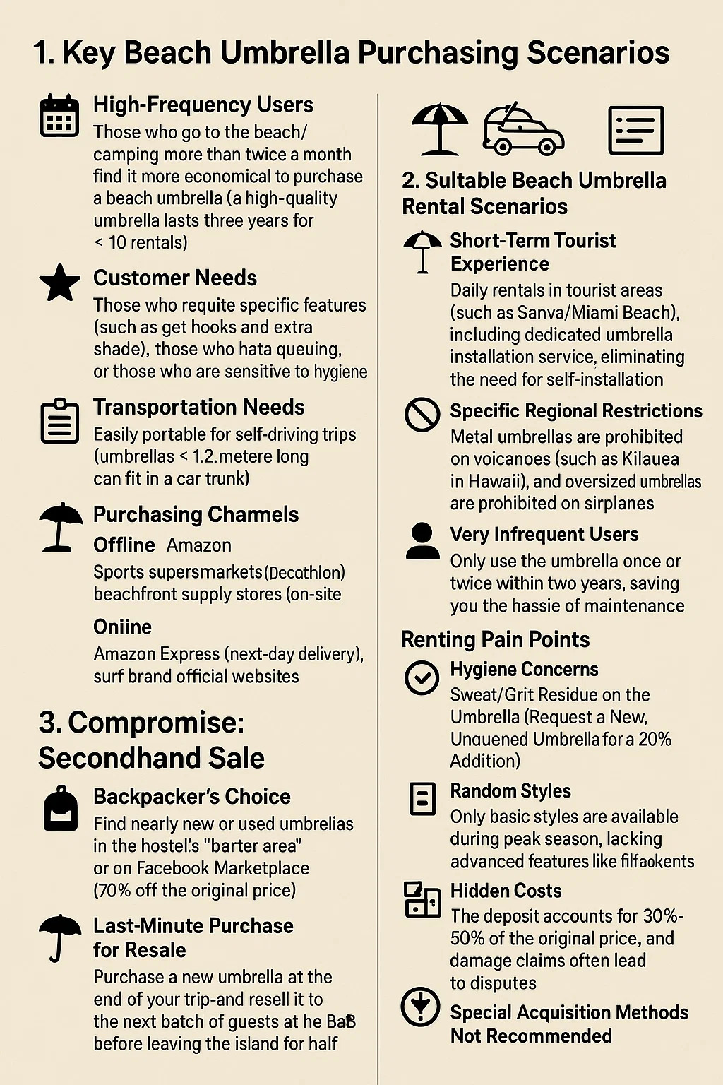 Những người dùng tần số cao: Những người đi đến bãi biển/cắm trại hơn hai lần một tháng, thấy thật kinh tế khi mua một chiếc ô bãi biển (một chiếc ô chất lượng cao kéo dài ba năm cho cho thuê ≈ 10).