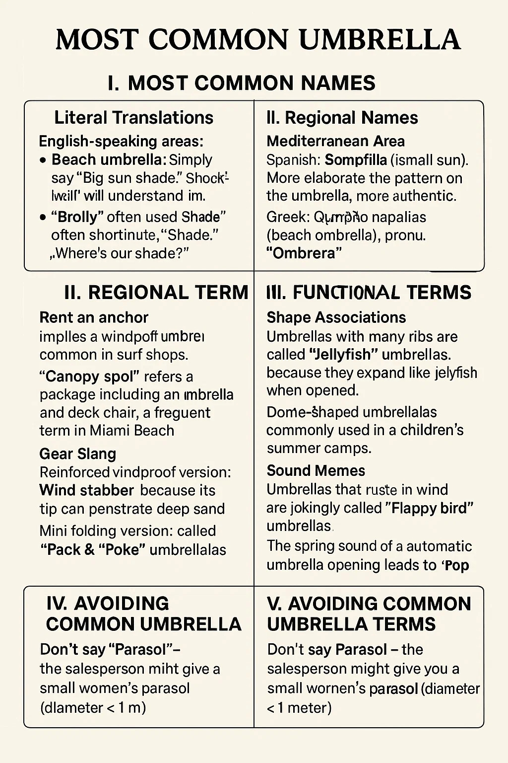 Dưới đây là tên gọi chung cho ô dù bãi biển trong các bối cảnh khác nhau: