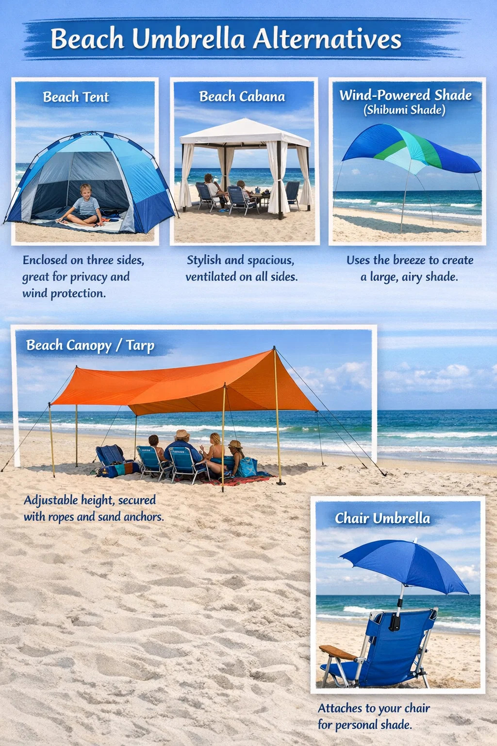Nếu bạn thấy việc mang hoặc dựng một chiếc ô trên bãi biển quá rắc rối hoặc lo lắng về việc nó bị gió thổi bay, thì trên thị trường có nhiều lựa chọn thay thế ổn định hơn với những khu vực có bóng râm lớn hơn.