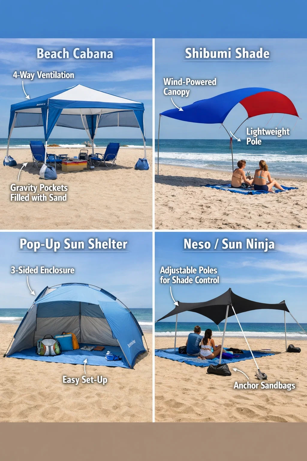 Tại sao lại tốt hơn: Những sản phẩm này thường được bao bọc ở ba mặt, giống như một nửa chiếc lều. Đối với những người có trẻ em hoặc vật nuôi, nó chặn gió, cát và tia UV từ các phía, mang lại khả năng chống nắng toàn diện hơn.
