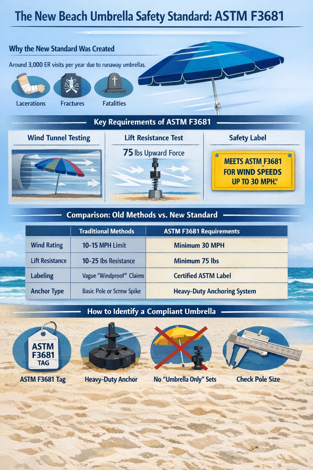 các Tiêu chuẩn ô dù đi biển mới là ASTM F3681-24 (cập nhật lên F3681-25) , thiết lập các yêu cầu hiệu suất chính thức đầu tiên về sức cản gió và an toàn neo đậu. cáco hướng dẫn mới này, một tiêu chuẩn ô bãi biển với đường kính 7,5 feet phải có khả năng chịu được tốc độ gió lên tới 30 dặm một giờ (MPH) mà không bay vào không khí. Ngoài ra, hệ thống neo phải cung cấp ít nhất Sức đề kháng 75 pound chống lại lực nâng hướng lên trên để đảm bảo nó luôn vững chắc trên cát.